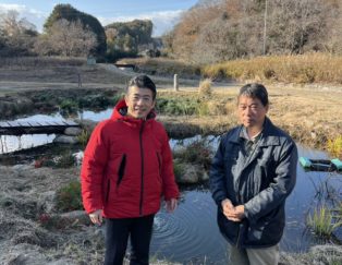 鈴木農園で製作する門松の材料を池にいれて保管してます。重徳代議士が父のお悔やみにきてくれたので、錦鯉の池に案内 [クリック]
