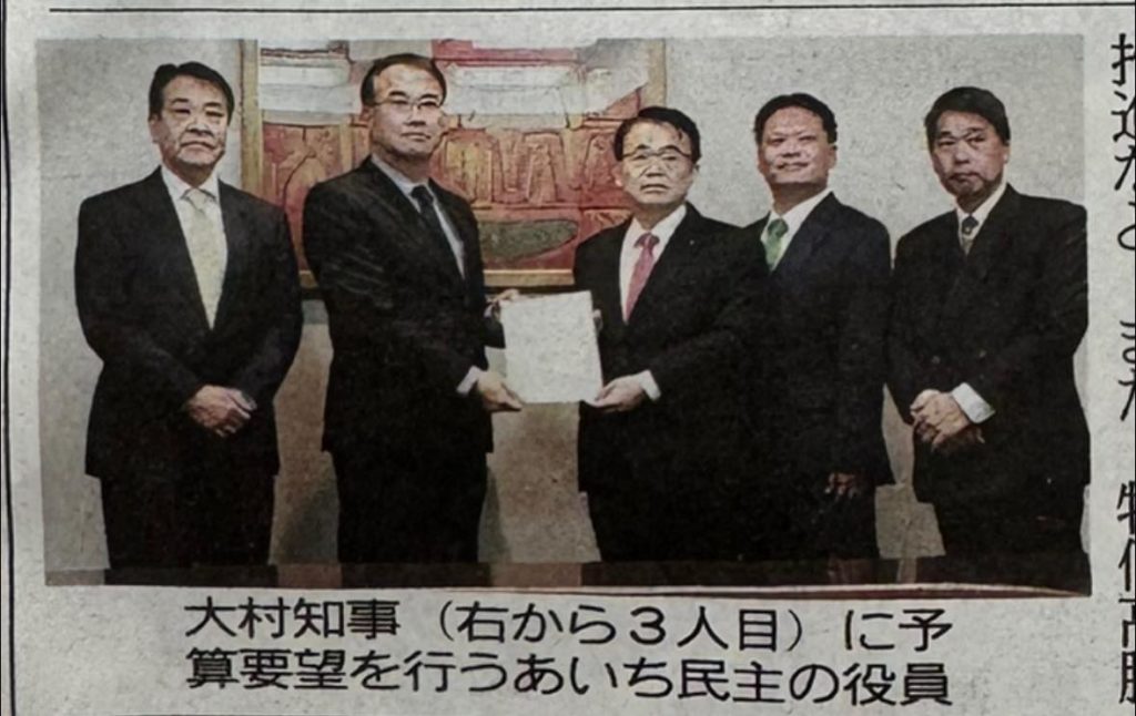 大村知事へあいち民主県議団として次年度予算要望をさせて頂きました。(写真は1月23日本日の中日新聞朝刊県内版より)