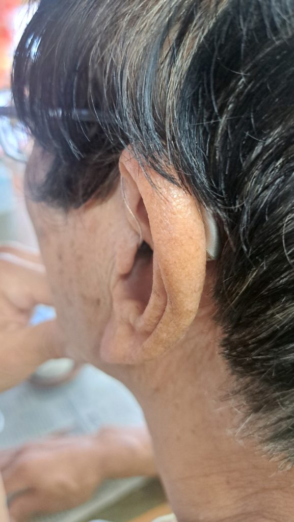 この方、耳の聞こえが悪く この方、耳の聞こえが悪く、補聴器を使っています。聞こえが悪く、なかなか会話が成り立たないと、会話が少なくなり、それがために孤立化して認知症になるリスクが高くなるので、補聴器を使うことで認知症を予防しています。