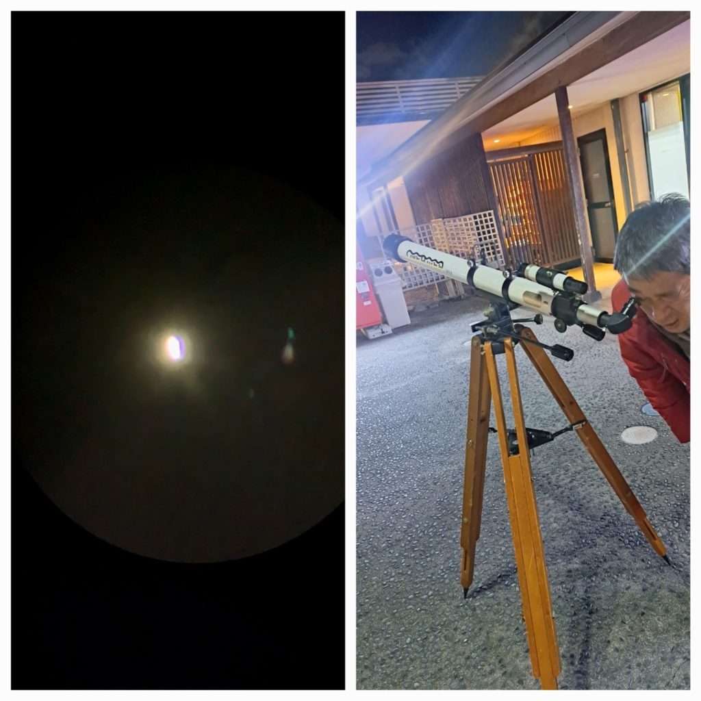 スーパー銭湯に行くとなじみの知り合いが何人もいました。外では星空観察会をやっていました。のぞかせてもらうと、金星を見せてもらいました。