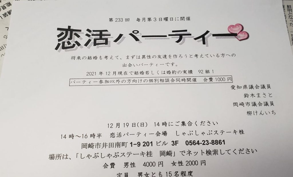 将来の結婚も考えて、まずは異性の友達を作ろうと考えている方向けの恋活パーティーを再開します。18年以上も続けているこのパーティー コロナで1年半ほど休止していましたが、再開します。今回で233回目です。