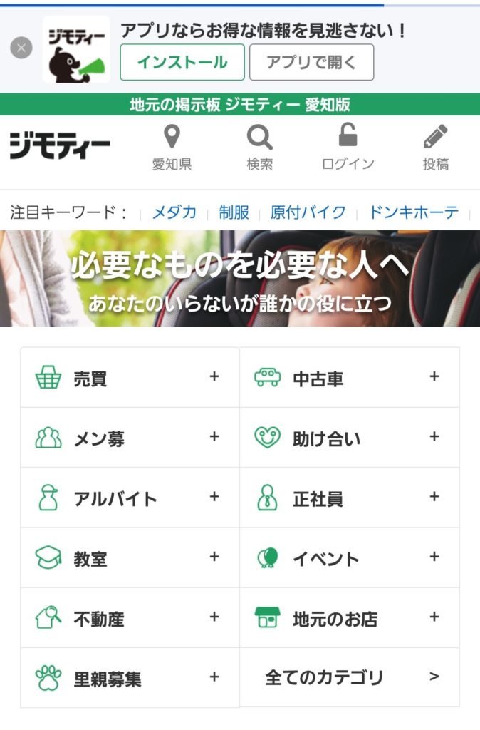 月間で1,000万人以上が利用する地域の情報サイトで、「売ります・あげます情報」「求人情報」「不動産情報」「助け合い情報」などカテゴリー別になった情報が、都道府県別や市区町村別ごとに掲載されています。