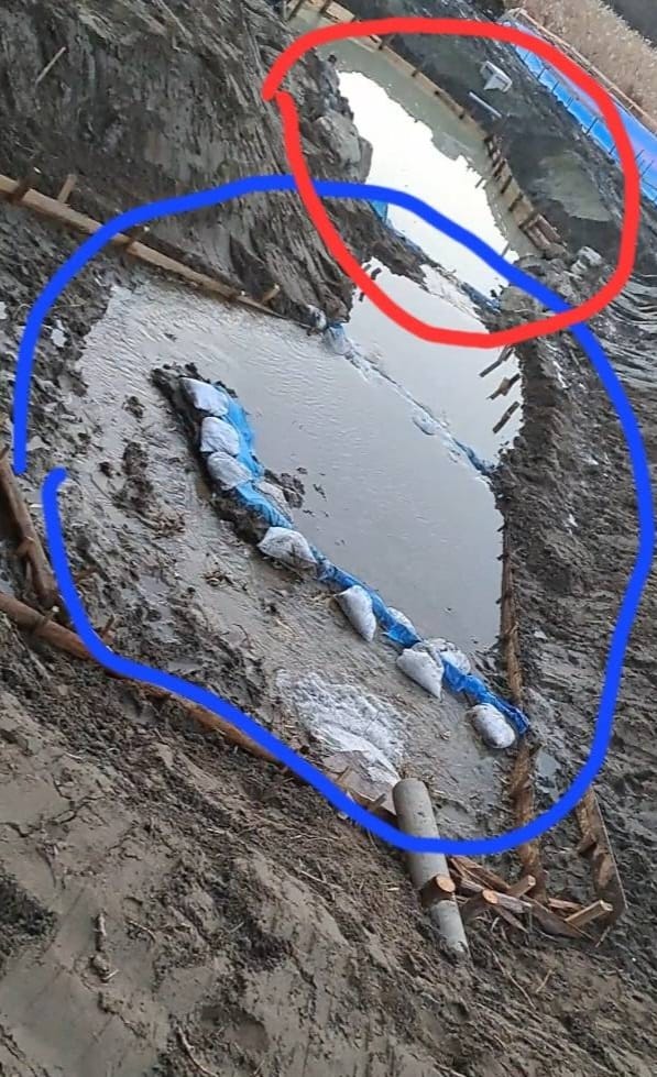 写真の赤丸部分は私が作った農業用のため池です。趣味で錦鯉を入れてあります。この池に砂が流れ込まないように浅い小川(青丸)を作ってあります。そこでメダカすくいや金魚すくいのイベントができるように考えています。