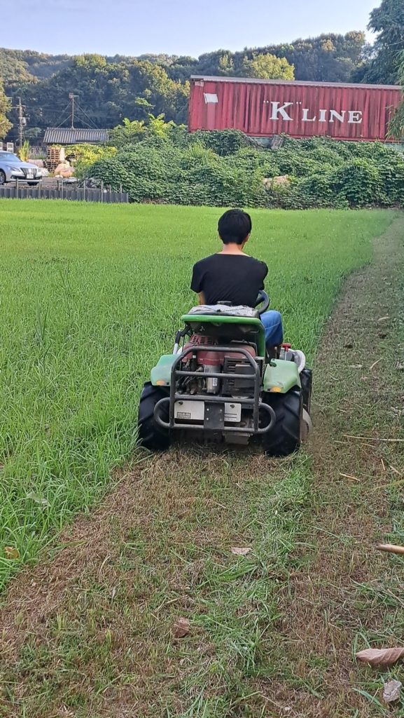 帰省している大学生の息子に家にいる間、一日ひとつ家の仕事を覚えてくださいをやっています。今日は乗用草刈り機の使い方を教えました。