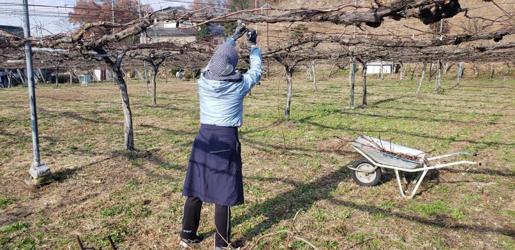ぶどうのせんていを妻が頑張ってます。12月から1月の冬にやります。写真のようにブドウ園の草刈りは私がやってます。