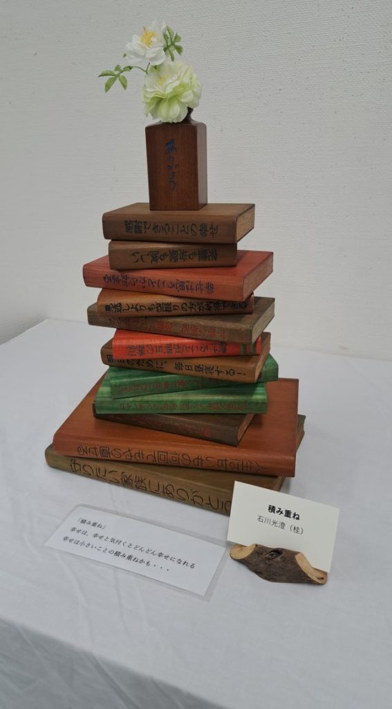 幸せを形に 木彫り教室「きつつき」作品展が美術館で開催されています。今年のテーマは「幸せを形に」です。この作品をみて、「幸せは、いろんな積み重ねの上に出来上がり、その上にやっと花が咲く」重いものだなと思いました。