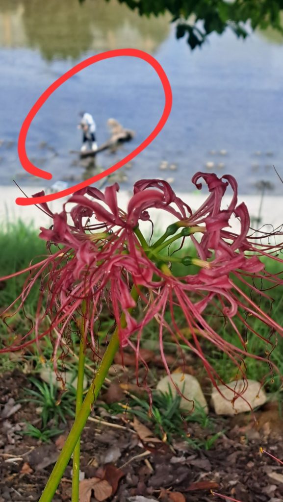 竜美丘会館の乙川沿いに咲いている彼岸花を陰で支えているボランティアの方です