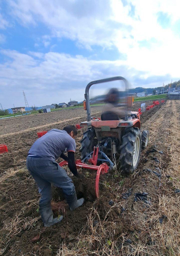 段取りよく次々に 焼きいもにするとおいしい紅はるかの収穫の様子です。4人一組で、トラクターで掘り起こすトラクターで掘り起こしたのを探す探したのをかごにいれるそのかごを軽トラに積み込む段取りよく次々に収穫されてました。