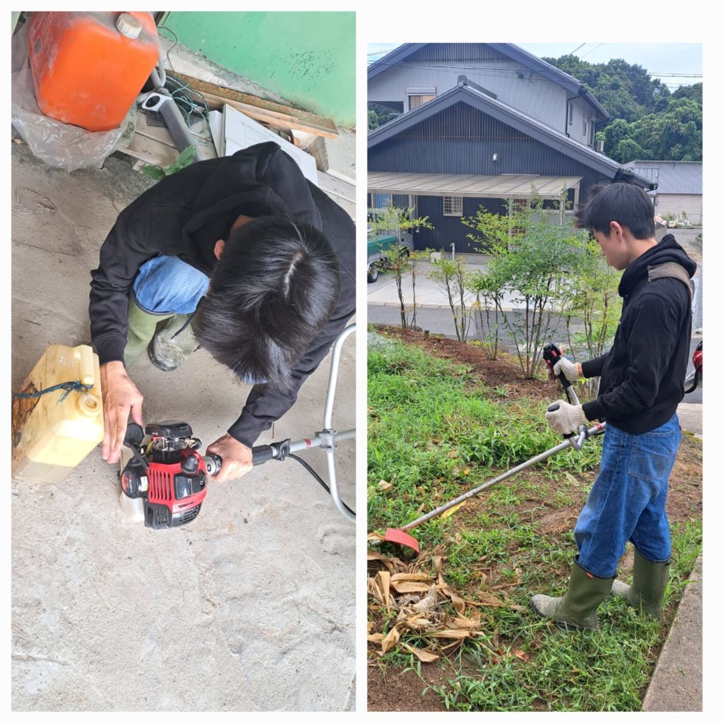 夏休みで大学生の息子が帰省しています。そこで、毎日一つずつ家の仕事を覚えてもらうようにしてます。今日は草刈りの仕方と、草刈り機の燃料の作り方を教えました。