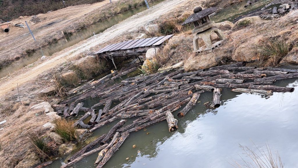 もうすぐしいたけがでる季節です。ちょうど今ごろに、しいたけの木を池につけて十分に水を吸わせておきます。そうするとたくさんしいたけがでます。