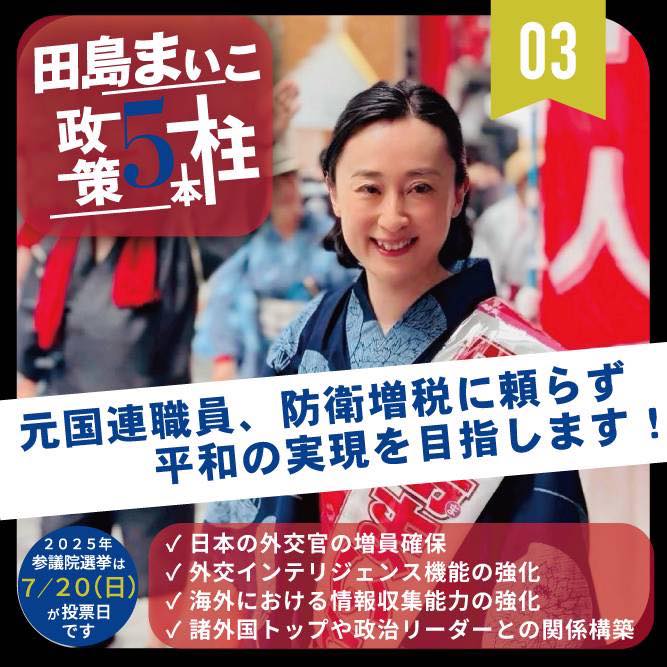 田島まいこの政策5本柱 参議院議員候補、田島まいこの政策5本柱。三本目は防衛増税に頼らない平和の実現。 期日前投票も始まっております。この夏の参議院選挙は、愛知県に立候補した田島まいこに、皆さまの一票を託してください!