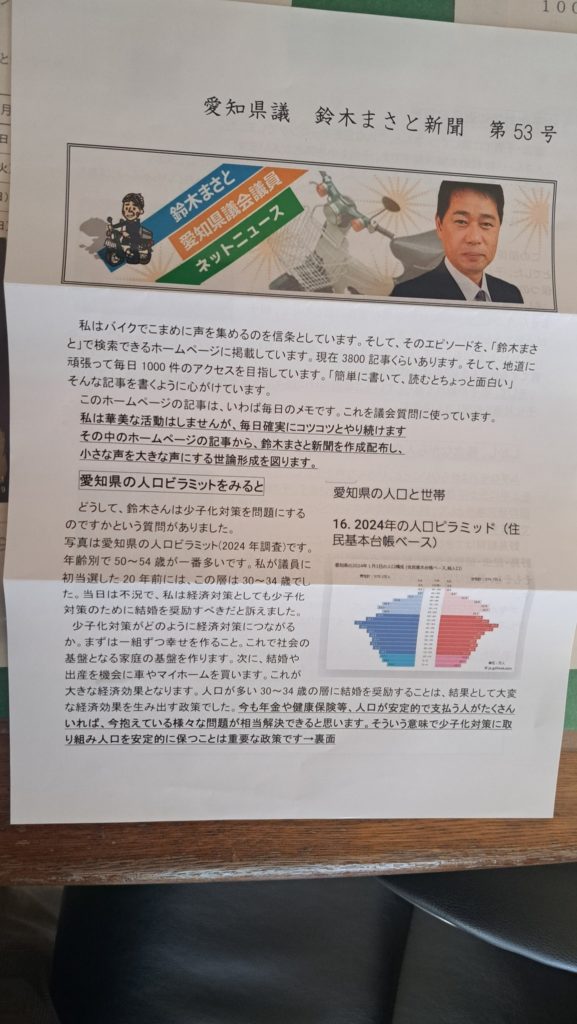 紙面からホームぺージへの誘導を 現在配布している会報です。しかし、紙面だけでは日々の活動を十分にお伝えできません。そこで毎日フェイスブックに掲載する記事を、「鈴木まさと」で検索できるホームページにも掲載しています。ホームページには約3000記事掲載してます。簡単に言うと、紙面からホームぺージへの誘導を図っています。