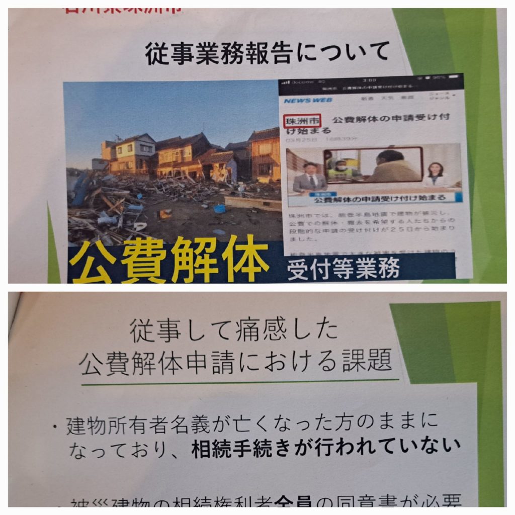 能登地震対応に参加した人からの報告会にきました。特に、相続手続きが行われていない建物の扱いがむずかしいとの報告がありました