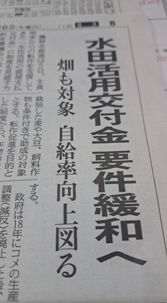自給率向上図る 農水省は主食用米からの転作を支援してきた「水田活用の直接支払交付金」を見直す方針を示した。水田機能の維持を前提とした要件を緩和して、畑で栽培した麦や大豆・飼料作物も条件付きで助成の対象とする。転作促進を目的とした制度から自給率向上を図る政策への転換が概要です。中日新聞2月6日より要約