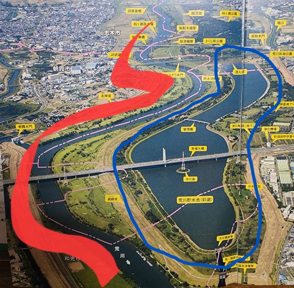 赤線が荒川 青枠が調整池です。