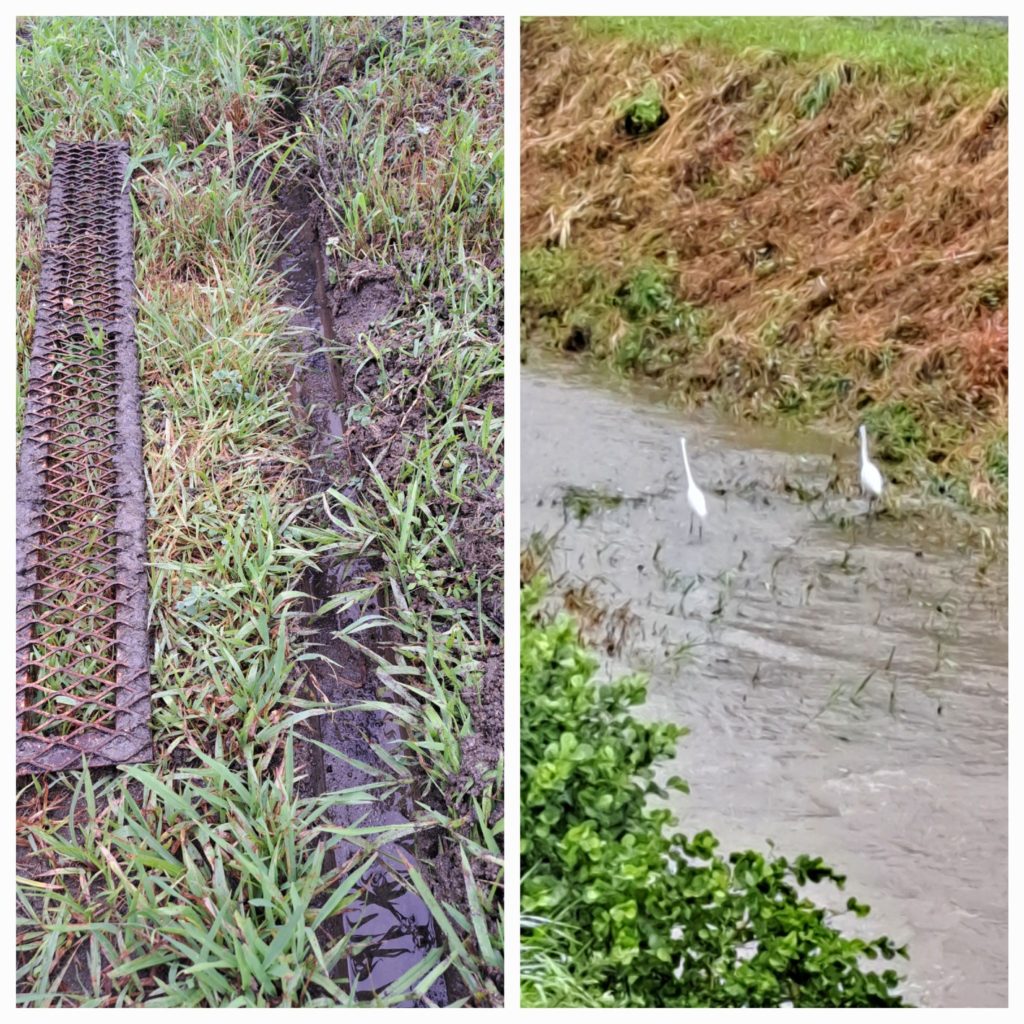 7/14の夜中は激しい雨でした 7/14の夜中は激しい雨でした。次の雨に備えて溝を掃除しています。大雨の後に溝が崩れるのは、溝の掃除がしてないことも大きな要因になります。こんな大雨の濁った川では、流れが緩やかなところに魚が避難するので、それを狙ってサギが浅瀬にずっといます。